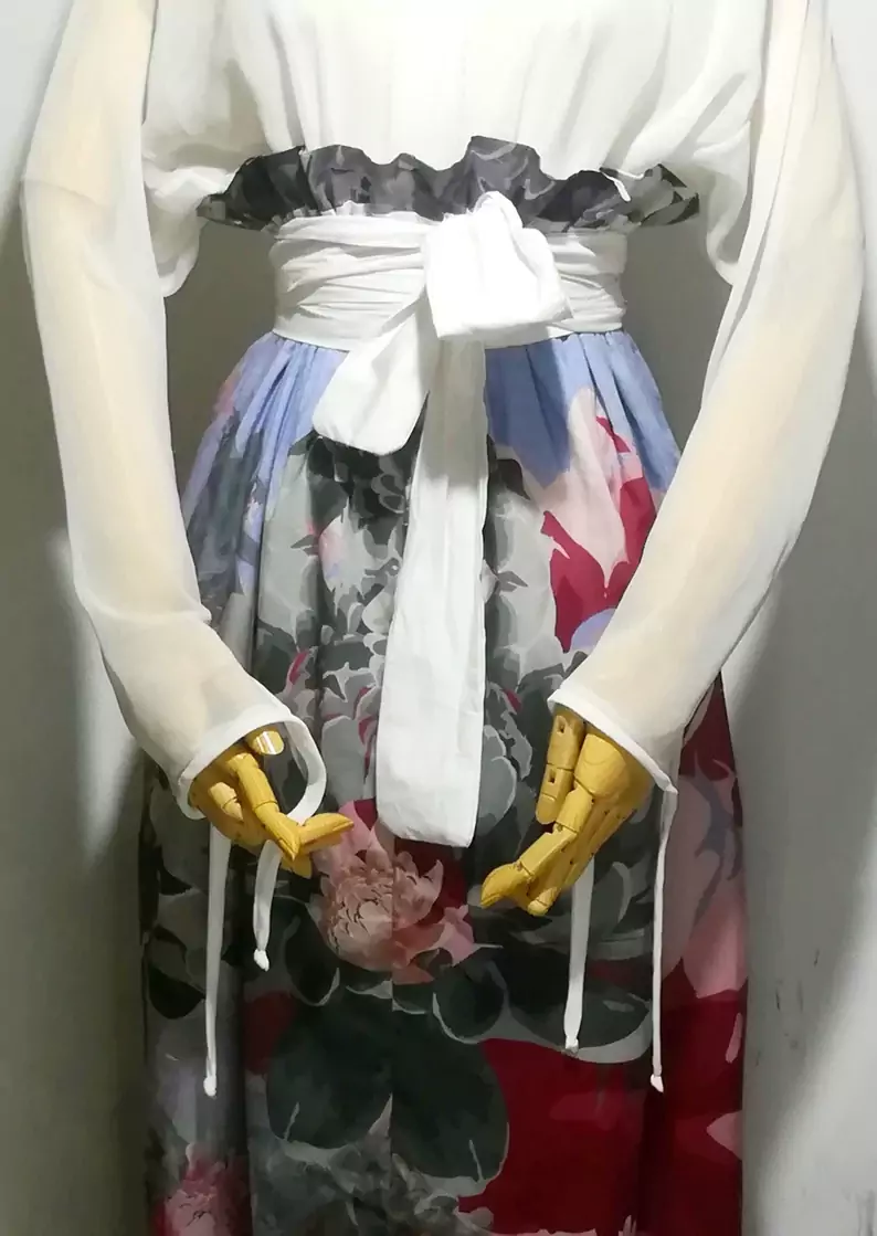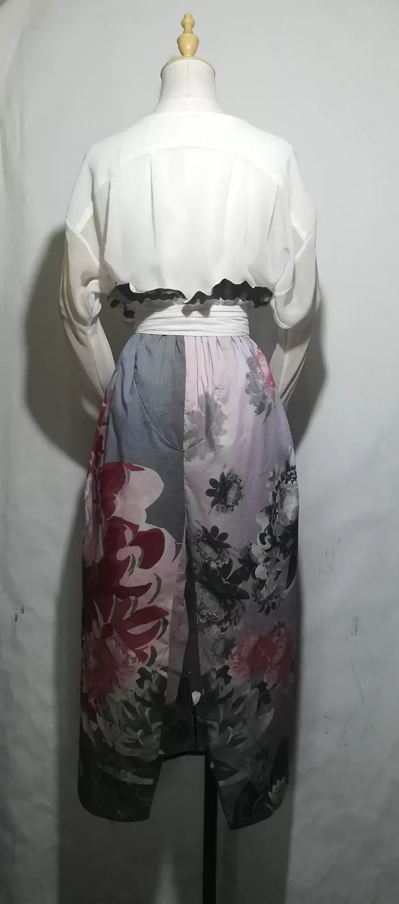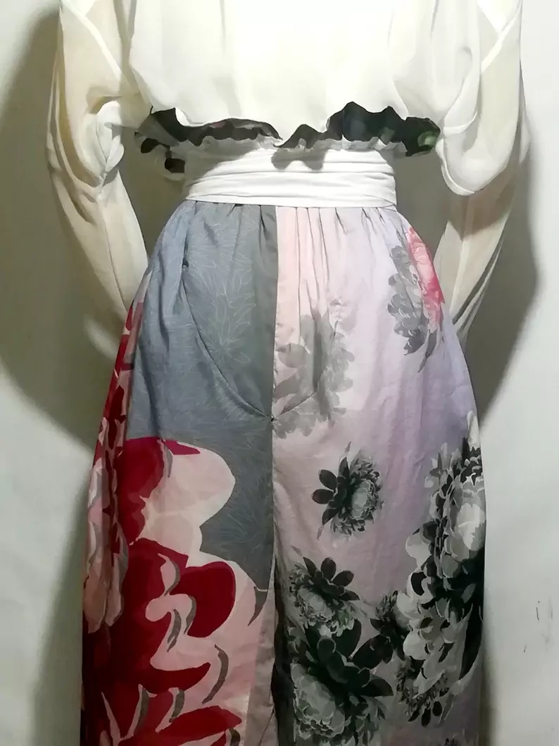 falda zero waste o cero residuos ajustable estampada con abertura trasera, medio forro de popelina de algodón recuperada y jareta en cintura tipo paper bag con cinto blanco extra largo de 6-8 cms de anchura.