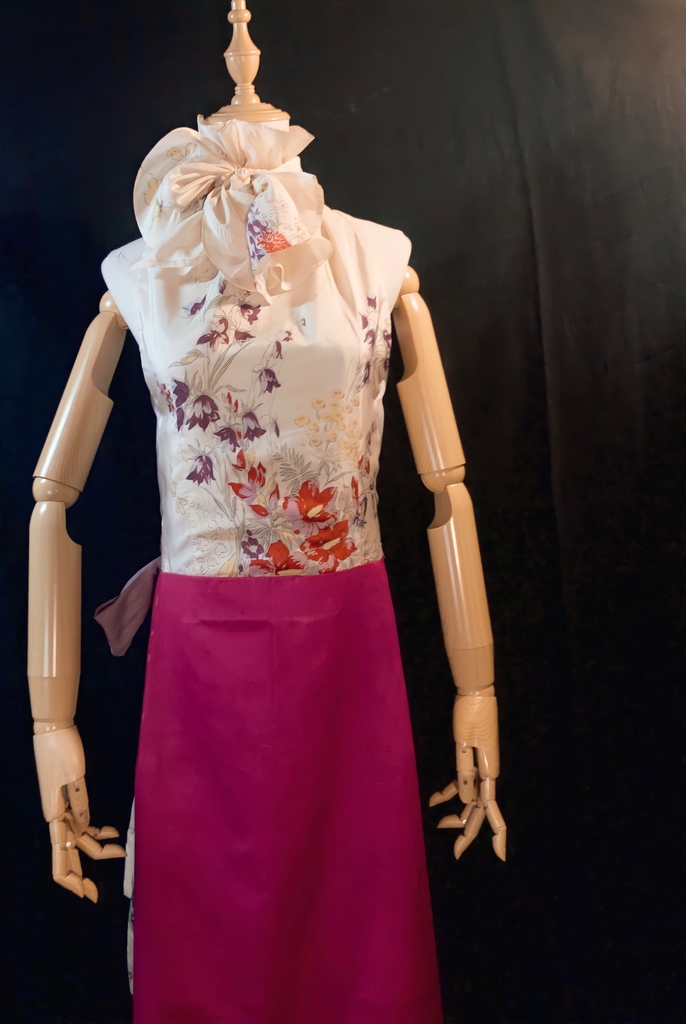 - **Diseño:** Vestido unitalla que se ajusta con amarres en la cadera alta, complementado por una chaqueta unitalla con una circunferencia de 132 cm, mangas largas oversized y un elegante cuello en V.
