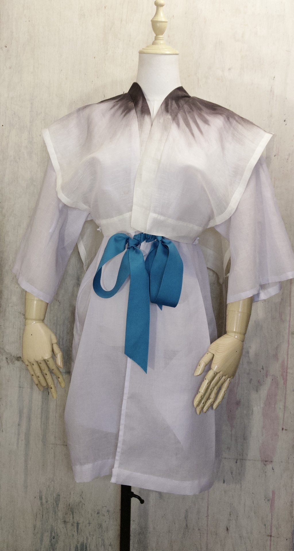 - **Diseño:** Corte relajado, mangas amplias y un lazo azul que se anuda al frente. Lleva bolsillos ocultos en la parte inferior.